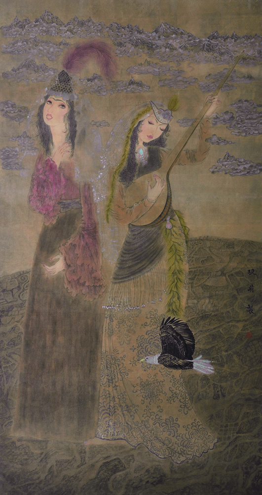 正是在新疆一直從事繪畫和教學(xué)工作,褚曉莉的工筆人物題材,多以塔吉克族為母題,創(chuàng)作了彈唱中的樂舞女子、老人和女孩子的肖像等系列作品,尤其是她描繪的新疆少數(shù)民族女性形象,線條精細(xì),疏密有致,服飾華美,既有淡雅的筆墨韻味,又有綺麗夢幻的色彩,人物造型氣質(zhì)優(yōu)雅、純凈、高貴,表情略帶一種淡淡的憂傷,畫面已脫離了單純的少數(shù)民族風(fēng)俗繪畫而進入到了"性靈"的精神層面,用至真、至善、至美的自然流露,直擊觀者的內(nèi)心,引發(fā)審美共鳴,也在不斷探索與完善中形成了自己都有的藝術(shù)風(fēng)格。