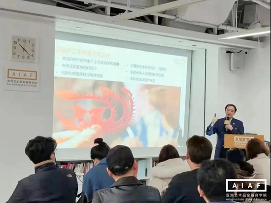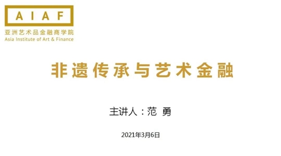 文化和旅游部、教育部、人力資源社會(huì)保障部啟動(dòng)了“中國(guó)非物質(zhì)文化遺產(chǎn)傳承人群研修研習(xí)培訓(xùn)計(jì)劃”。在文化和旅游部非遺司的指導(dǎo)下,上海市文化和旅游局非遺處的支持下,由上海大學(xué)上海美術(shù)學(xué)院和上海公共藝術(shù)協(xié)同創(chuàng)新中心承辦的“中國(guó)非物質(zhì)文化遺產(chǎn)傳承人群研修研習(xí)培訓(xùn)計(jì)劃(上海傳統(tǒng)工藝創(chuàng)新設(shè)計(jì)研修班)”于2021年3月6日上午來(lái)到亞洲藝術(shù)品金融商學(xué)院(AIAF),邀請(qǐng)范勇院長(zhǎng)就“非遺傳承與藝術(shù)金融”為該項(xiàng)目學(xué)員們進(jìn)行授課。