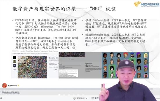 在《數(shù)字藝術(shù)資產(chǎn)(NFT)及運(yùn)營邏輯研究專題》課程中,西沐院長首先提醒大家:中國藝術(shù)品市場為什么要關(guān)注數(shù)字化,中國藝術(shù)品市場的底層邏輯結(jié)構(gòu)是如何變化的;數(shù)字化藝術(shù)市場發(fā)展的過程與態(tài)勢;數(shù)字藝術(shù)資產(chǎn)與NFT;數(shù)字藝術(shù)資產(chǎn)交易邏輯框架;數(shù)字藝術(shù)資產(chǎn)交易創(chuàng)新發(fā)展架構(gòu);當(dāng)下熱點(diǎn)問題解析等六個(gè)方面,講授了數(shù)字藝術(shù)資產(chǎn)交易市場發(fā)展的現(xiàn)狀和未來態(tài)勢。并從當(dāng)下異軍突起的數(shù)字藝術(shù)資產(chǎn)新業(yè)態(tài)展開了理論與實(shí)踐的前沿思想引領(lǐng),從維護(hù)國家文化生態(tài)安全,健全中國藝術(shù)市場價(jià)值維度,引領(lǐng)藝術(shù)資產(chǎn)消費(fèi)潮流的時(shí)代前沿,進(jìn)一步實(shí)證性研究了數(shù)字經(jīng)濟(jì)新時(shí)代背景下,中國數(shù)字藝術(shù)金融理論體系的創(chuàng)新與完善。