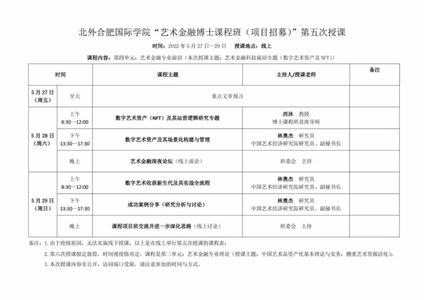 2022年5月27日至29日,北京外國語大學(xué)合肥國際學(xué)院2022“藝術(shù)金融博士課程班(項(xiàng)目招募)”第五次集中授課在騰訊會(huì)議線上舉行。課程內(nèi)容為:藝術(shù)金融科技前沿(數(shù)字藝術(shù)資產(chǎn)與NFT)。