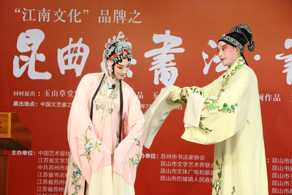 展覽“玉出昆岡——歷代名人詠昆山書(shū)畫作品集”部分,以歷代名人吟詠昆山的詩(shī)歌為主線,精選古詩(shī)百首作為書(shū)法和繪畫創(chuàng)作的文本,緊密圍繞歌詠昆山、描繪昆山、書(shū)寫昆山的主題,淋漓盡致地展現(xiàn)昆山文化;“玉山雅集-詩(shī)聯(lián)作品”部分,以昆山巴城的私家園林“玉山草堂”為題材,將被名人詩(shī)文詠唱的景點(diǎn)融入中國(guó)書(shū)法的行云流水之中;“昆曲與書(shū)法”部分,將書(shū)法藝術(shù)與昆曲藝術(shù)融為一體,將昆曲的“生態(tài)文化”成功轉(zhuǎn)化為“文本文化”,引導(dǎo)人們以全新理念和視野了解昆曲大千世界。