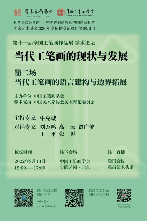 2022年8月13日下午,由中國工筆畫學會主辦、中國美術(shù)家協(xié)會美術(shù)理論委員會學術(shù)支持的,國家藝術(shù)基金資助項目“第十一屆全國工筆畫作品展”系列論壇“當代工筆畫的現(xiàn)狀與發(fā)展”第二場“當代工筆畫的語言建構(gòu)與邊界拓展”,在中國工筆畫學會成功舉行。六位嘉賓結(jié)合“第十一屆全國工筆畫作品展”,就當代工筆的語言探索、工筆傳統(tǒng)的當代價值、當代工筆的跨界融合、當代工筆的精神意蘊等大家關(guān)注的話題展開精彩對話。論壇合作的雅昌藝術(shù)頭條直播吸引了近36萬觀眾在線觀看直播和回放。