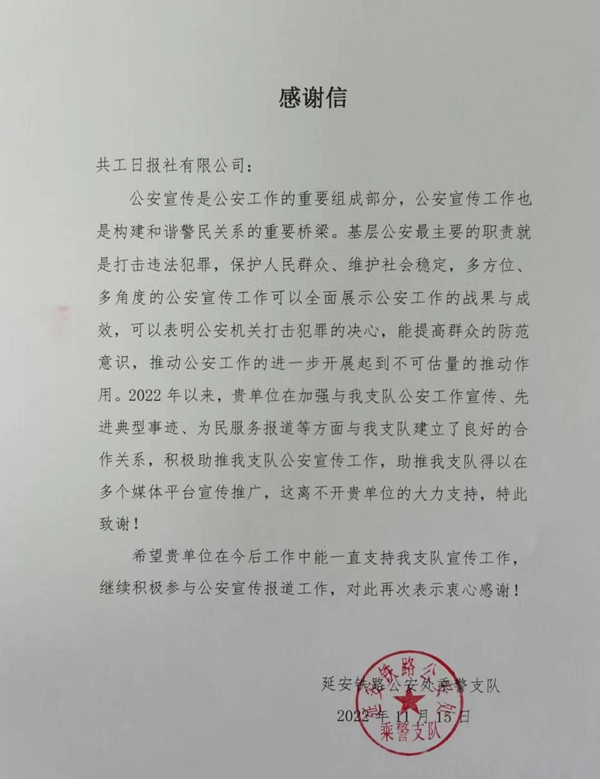 共工日報(bào)社財(cái)經(jīng)局11月18日消息(馬立瑜)近日,共工日報(bào)社有限公司收到一封來自延安鐵路公安處乘警支隊(duì)的感謝信。信中對共工日報(bào)社在2022年以來,共工日報(bào)社與延安鐵路公安處乘警支隊(duì)公安工作宣傳,先進(jìn)典型事跡,為民服務(wù)報(bào)道等方面所做出的貢獻(xiàn)給予了肯定和感謝。