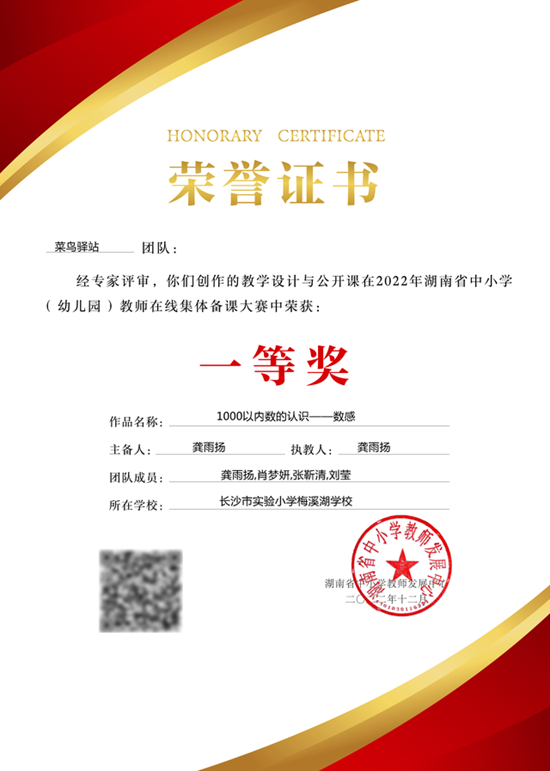 在本次在線備課大賽中,該校參賽教師積極參與、精心備課、認(rèn)真研討、眾籌眾智、深入鉆研課堂教學(xué)藝術(shù),充分展示了長沙市實(shí)驗(yàn)小學(xué)梅溪湖學(xué)校優(yōu)良的教育教學(xué)教研氛圍。其中,數(shù)學(xué)團(tuán)隊(duì)《1000以內(nèi)數(shù)的認(rèn)識——數(shù)感》主備人:龔雨揚(yáng),(團(tuán)隊(duì)成員:龔雨揚(yáng),肖夢妍,張靳清,劉瑩)榮獲省級一等獎(jiǎng);
