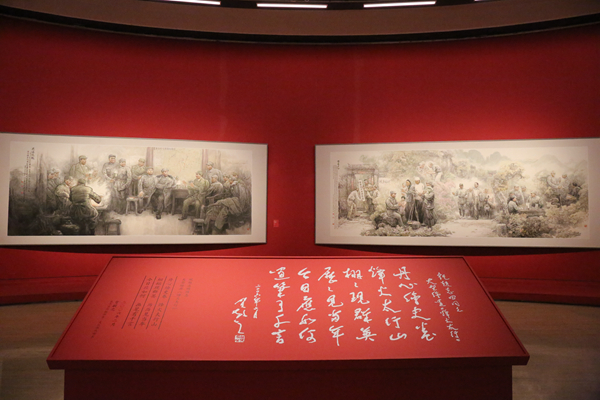 此次展覽著重展出了大型組畫《烽火太行》。2005年,趙志田先生為紀(jì)念抗戰(zhàn)60周年,創(chuàng)作此畫,2015年,他在原畫的基礎(chǔ)上重新構(gòu)圖增加內(nèi)容、篇幅,最終于2019年底完成!斗榛鹛小肥蔷薹鶜v史組畫,由魚水情深、銅墻鐵壁、共謀抗戰(zhàn)、得道多助、正義之歌、普天同慶六個(gè)段落組成。為創(chuàng)作此畫,趙志田先生多次深入太行老區(qū)收集資料,反復(fù)思考構(gòu)圖,多次修改。全畫共刻畫了260多個(gè)人物,畫得形似而又傳神。整幅作品宛如一部交響樂。趙志田先生懷揣著揮之不去的“太行情懷”,熔鑄了抗日戰(zhàn)爭(zhēng)中犧牲的父輩給他留下的精神的影響,以及文革后多次深入太行引發(fā)的靈感的跡化,真實(shí)地表現(xiàn)了中華民族團(tuán)結(jié)一致、不受屈辱、反抗侵略的民族精神,呼吁著現(xiàn)在社會(huì)更多的年輕人勿忘國(guó)恥、以史為鑒,要像先輩們學(xué)習(xí),學(xué)習(xí)民族精神,做國(guó)家的脊梁。