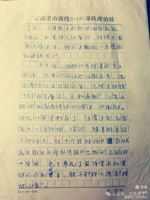 去年底,他隨部參戰(zhàn)來(lái)到老山前線(xiàn),在政治處任報(bào)道員。在南疆的日日夜夜里,他無(wú)時(shí)不被戰(zhàn)士們“艱苦奮斗,無(wú)私奉獻(xiàn)”的老山精神和高尚情懷所感動(dòng)、所激勵(lì)。他比以前更勤奮了,經(jīng)常不顧危險(xiǎn),深入一線(xiàn)陣地、哨所、貓耳洞采訪干部戰(zhàn)士,僅10個(gè)月時(shí)間就在《人民日?qǐng)?bào)》、《解放軍報(bào)》等報(bào)刊上稿40余篇,充分展現(xiàn)了前線(xiàn)官兵的英雄形象和風(fēng)采,被干部戰(zhàn)士譽(yù)為“戰(zhàn)地記者”。