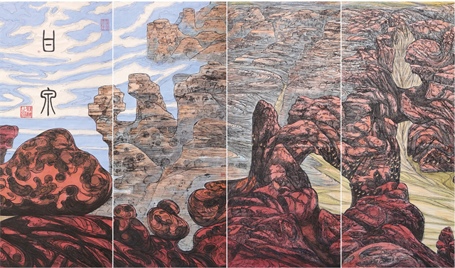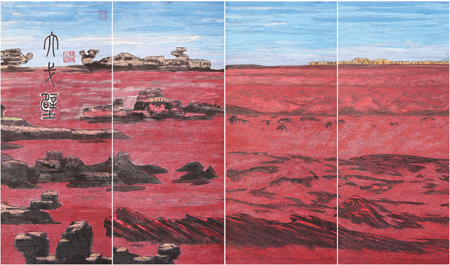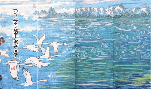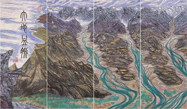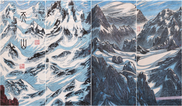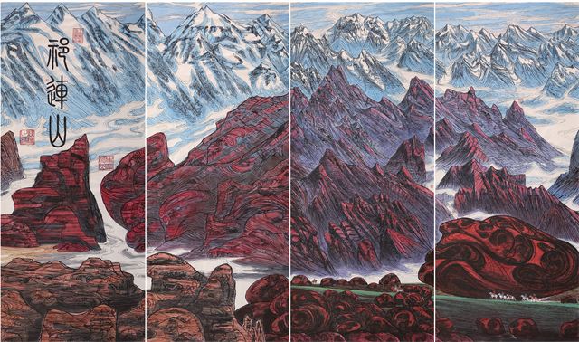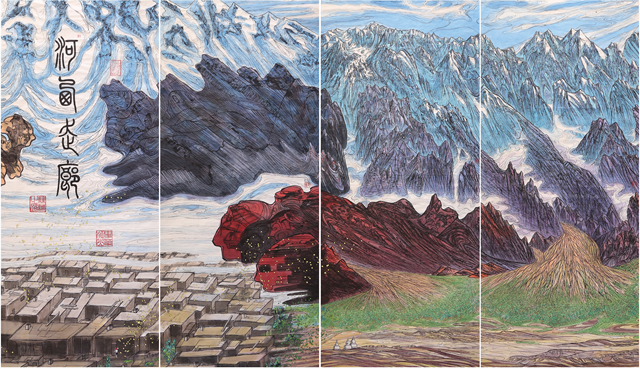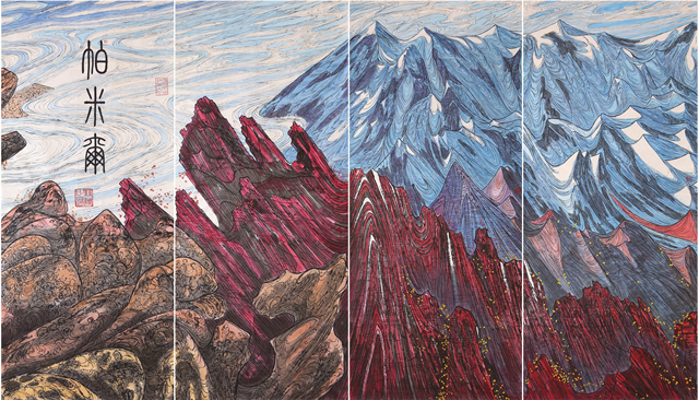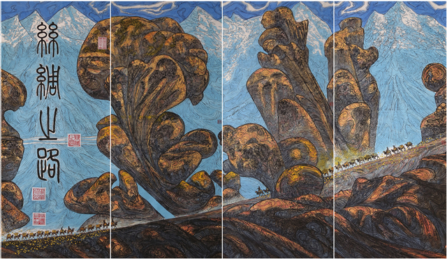 我們的視線越過(guò)世界屋脊,看到的是波瀾壯闊、五彩斑斕、氣勢(shì)磅礴的絲綢之路那震撼人心的景觀。我們首先看到的是古絲綢之路上最為艱險(xiǎn)和神秘的帕米爾高原,接著是最偉大的山脈昆侖山。古往今來(lái)的人們稱(chēng)為“萬(wàn)山之祖”、“中華龍脈”、“萬(wàn)神之鄉(xiāng)”的昆侖確實(shí)成為“亞洲脊柱”。“赫赫我祖”來(lái)自昆侖,中華民族的文化史上昆侖具有顯赫地位,正因如此作者用長(zhǎng)達(dá)四十多米篇幅創(chuàng)作出地動(dòng)山搖的昆侖山的氣勢(shì),讓我們無(wú)法克制從內(nèi)心發(fā)出驚嘆!敬畏!