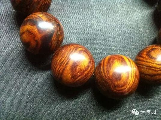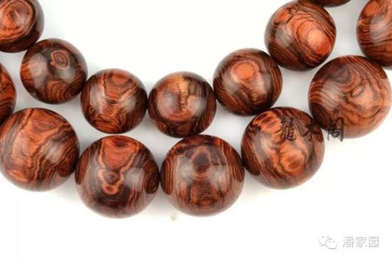 (5)紋路:紫檀柳珠子多是順紋的,紋路發(fā)紅且感覺很淡,黃花梨的紋路很少有發(fā)紅的,個(gè)別也是紫色變淺過渡成紅的。