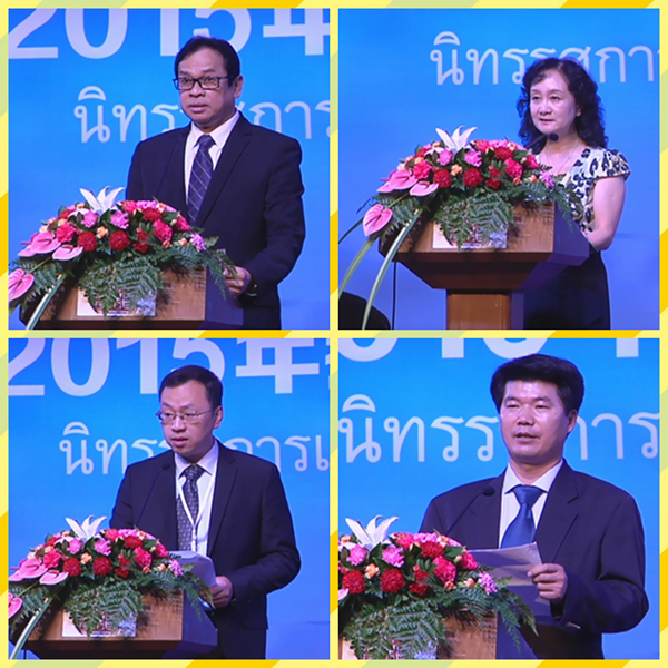 左上:泰國教育部部長(zhǎng)助理索庵先生在開幕式上致辭 / 右上:曼谷中國文化中心主任藍(lán)素紅女士在開幕式上致辭 / 左下:山東大學(xué)國際事務(wù)部副部長(zhǎng)姬銳先生在開幕式上致辭 / 右下:留學(xué)中國聯(lián)盟代表黃中在開幕式上致辭
