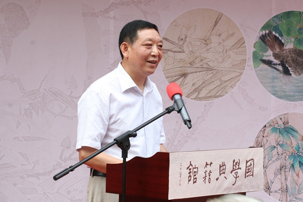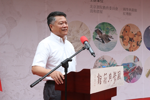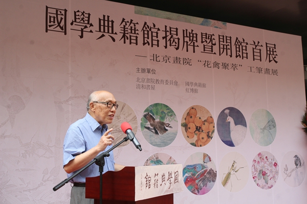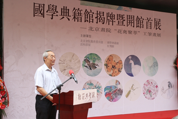 徐慶平教授講話中認(rèn)為,所有的中國傳統(tǒng)文化都合到一起可稱為國學(xué),那么也應(yīng)該包括美術(shù)這一部分。他回憶起徐悲鴻先生講過,美術(shù)雖是小技,大可以立大德,造大器為人類勝出。徐先生更高度評價(jià)開館首展——北京畫院“花禽聚萃”工筆畫展的藝術(shù)水平。徐先生說,從國學(xué)典籍館今天的起步來看,可以看到它的未來,這將是我們國家、是北京的一個(gè)很重要的文化陣地、文化平臺(tái)。