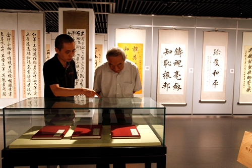 著名書畫家、全國政協(xié)委員、中國人民大學(xué)藝術(shù)學(xué)院創(chuàng)院院長徐慶平教授在策展人、國學(xué)典籍館館長宋雙江的陪同下觀看展覽