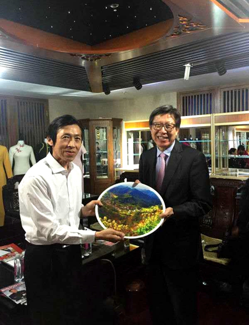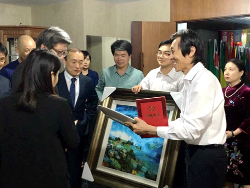 中華光影平面油畫藝術學會于江會長向樸亨埈秘書長贈送光影平面油畫瓷盤