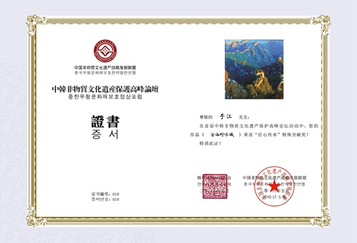 此次光影平面油畫在韓國國會展出期間。國會秘書長樸亨峻先為于江先生頒發(fā)了由本人親筆簽名的大韓民國國會收藏證書。經(jīng)過中韓非遺高峰論壇組委會藝術評價專家委員會綜合評價,中華光影平面油畫榮獲中韓非物質文化遺產保護高峰論壇暨逸品神工藝術精品展和“匠心傳承•特別貢獻獎”。此次中華光影平面油畫亮相韓國國會會進一步提示攝影藝術對中國自然文化遺產和非物質文化遺產保護傳承的重要性,弘揚了中華當代藝術文化。促進了中韓非物質文化遺產的交流與合作,對中華光影平面油畫藝術走向世界有著重要而深遠的意義。(黃中/文)