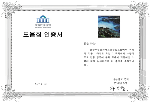 大韓民國國會樸亨埈秘書長親筆簽署的收藏證書
