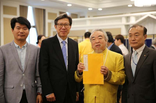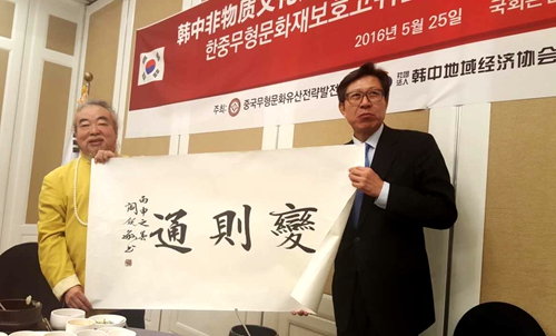 2016年5月24日上午,由文化部、中國文化產(chǎn)業(yè)智庫研究中心支持;大韓民國國會、中國非遺資源管理評價研究委員會、中國非物質(zhì)文化遺戰(zhàn)略發(fā)展聯(lián)盟聯(lián)合主辦;中華炎黃文化研究會硯文化聯(lián)合會、炎黃書畫家協(xié)會協(xié)辦的中韓非物質(zhì)文化遺產(chǎn)高峰論壇在首爾韓國國會舉行。著名書法教育家、炎黃書畫家協(xié)會主席閆銳敏應(yīng)邀出席高峰論壇暨逸品神工藝術(shù)精品展,并被列席逸品神工藝術(shù)精品展學(xué)術(shù)委員顧問,在韓中地域經(jīng)濟協(xié)會李相基會長與組委會秘書長黃中的陪同下,韓國國會秘書長兼總統(tǒng)辦公室事務(wù)總長樸亨峻親臨論壇致歡迎辭,隨后參觀了閆銳敏先生的書法及新華出版社出版的書法精品小楷《道德經(jīng)》卷。