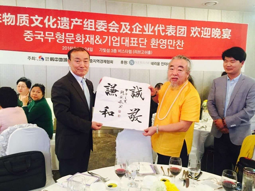 炎黃書畫家協(xié)會主席閆銳敏向韓中地域經(jīng)濟協(xié)會會長李相基贈送書法作品