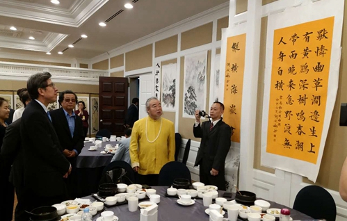 炎黃書畫家協(xié)會主席閆銳敏向國會秘書長樸亨埈介紹其書法作品