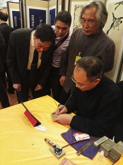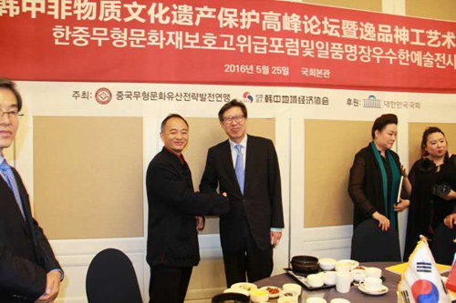2016年5月24日上午,由文化部、中國(guó)文化產(chǎn)業(yè)智庫(kù)研究中心支持;大韓民國(guó)國(guó)會(huì)、中國(guó)非遺資源管理評(píng)價(jià)研究委員會(huì)、中國(guó)非物質(zhì)文化遺戰(zhàn)略發(fā)展聯(lián)盟聯(lián)合主辦;中華炎黃文化研究會(huì)硯文化聯(lián)合會(huì)、中國(guó)非遺戰(zhàn)略發(fā)展聯(lián)盟玉專(zhuān)委協(xié)辦的中韓非物質(zhì)文化遺產(chǎn)高峰論壇在首爾韓國(guó)國(guó)會(huì)舉行。著名硯雕家王安平應(yīng)邀出席高峰論壇暨逸品神工藝術(shù)精品展,在韓中地域經(jīng)濟(jì)協(xié)會(huì)李相基會(huì)長(zhǎng)與組委會(huì)秘書(shū)長(zhǎng)黃中的陪同下,韓國(guó)國(guó)會(huì)秘書(shū)長(zhǎng)兼總統(tǒng)辦公室事務(wù)總長(zhǎng)樸亨峻親臨論壇致歡迎辭,隨后參觀(guān)了王安平大師代表中國(guó)非遺傳承人現(xiàn)場(chǎng)展示端硯制作技藝。