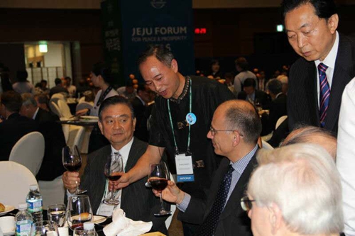 制硯大師王安平和韓國(guó)總理黃教安與日本首相村山富市在濟(jì)州論壇歡迎晚宴上親切交流