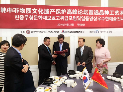 2016年5月24日上午,由文化部、中國文化產(chǎn)業(yè)智庫研究中心支持;中國非遺戰(zhàn)略發(fā)展聯(lián)盟玉雕專業(yè)委員會選送的后妹翡翠系列主題玉雕作品在大韓民國國會展出。在韓中地域經(jīng)濟(jì)協(xié)會李相基會長和中國非遺戰(zhàn)略發(fā)展聯(lián)盟玉專委江功堯主任的陪同下,韓國國會秘書長兼總統(tǒng)辦公室事務(wù)總長樸亨埈親臨論壇致歡迎辭,隨后參觀了后妹翡翠系列主題玉雕精品。