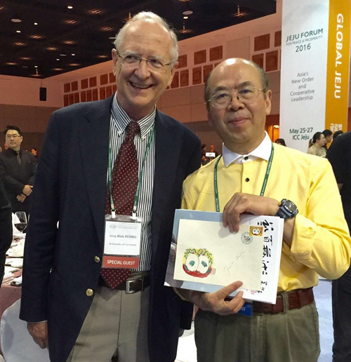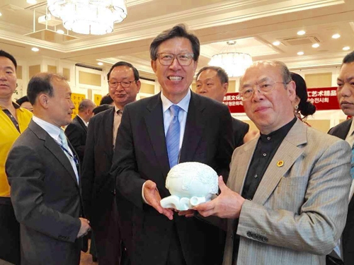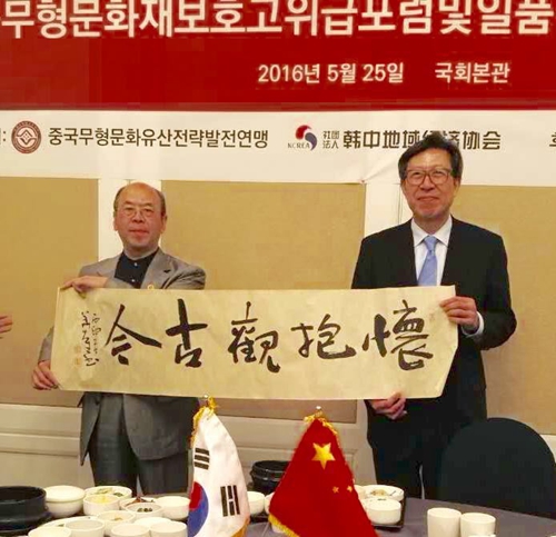 2016年5月24日上午,由文化部、中國文化產(chǎn)業(yè)智庫研究中心支持;大韓民國國會、中國非遺資源管理評價研究委員會、中國非物質文化遺戰(zhàn)略發(fā)展聯(lián)盟聯(lián)合主辦;中華炎黃文化研究會硯文化聯(lián)合會、中國非遺戰(zhàn)略發(fā)展聯(lián)盟玉專委、世界藝術收藏聯(lián)合會協(xié)辦的中韓非物質文化遺產(chǎn)高峰論壇在首爾韓國國會舉行。著名陶瓷藝術家、書畫家華奎應邀出席高峰論壇暨逸品神工藝術精品展,在韓中地域經(jīng)濟協(xié)會李相基會長與組委會秘書長黃中的陪同下,韓國國會秘書長兼總統(tǒng)辦公室事務總長樸亨埈親臨論壇致歡迎辭,隨后參觀了華奎大師的書畫及陶瓷藝術作品。