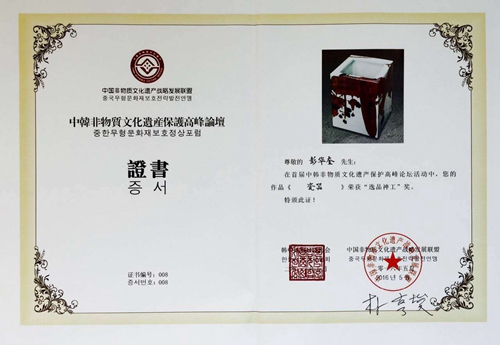 此次陶瓷藝術大師華奎書畫及陶瓷藝術在在韓國國會展出期間。還作為中韓文化交流大使身份贈送韓國國會陶瓷作品,以展中國陶瓷藝術之魅力神韻;國會秘書長樸亨峻為華奎頒發(fā)了由本人親筆簽名的大韓民國國會收藏證書。經(jīng)過中韓非遺高峰論壇組委會藝術評價專家委員會綜合評價,華奎參展陶瓷作品《勤勞智慧中國娃》、《書法對聯(lián)》作品分別榮獲中韓非物質文化遺產(chǎn)保護高峰論壇暨逸品神工藝術精品展最高獎項:逸品神工獎和匠心傳承•特別貢獻獎”。此外著名陶瓷藝術家,世界兒童藝術館館長華奎還代表中國非遺傳承人出席第十一屆濟州論壇中日韓企業(yè)家論壇及相關分論壇進行藝術交流活動,得到了業(yè)界人士稱贊及出席濟州論壇的部分國際政要的接見與贊賞。其天工人工合一并兼具大國工匠精神的陶瓷藝術展示了中國陶瓷工藝美術大師的自信及文化自覺!促進了中韓非物質文化遺產(chǎn)的交流對話與合作發(fā)展,對民族文化復興時期的中華陶瓷藝術文化的普及和輸出有著重要而深遠的意義。