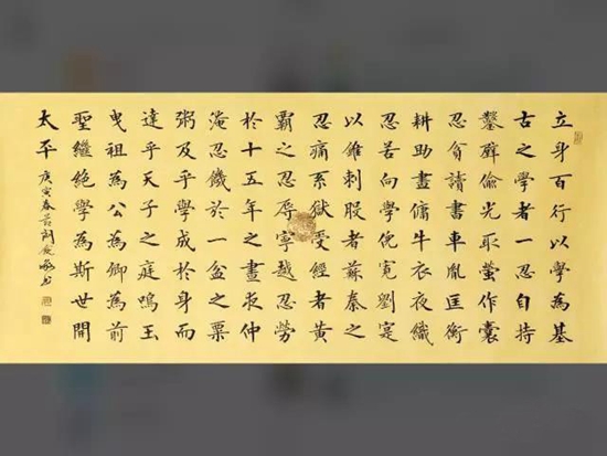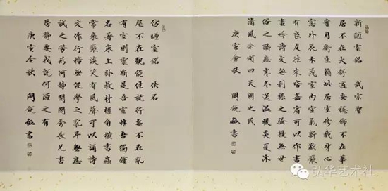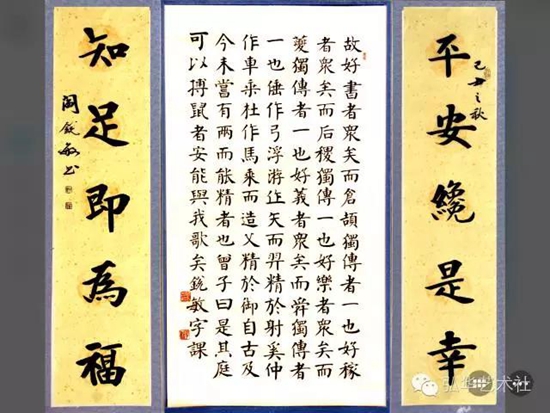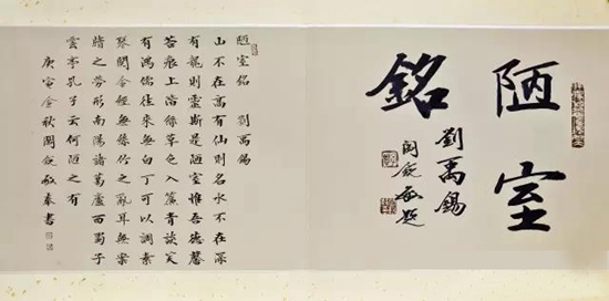 橫披指橫幅作品,橫長(zhǎng)豎短。這種格式可以寫少數(shù)字,自右而左寫一行,也可以橫式直寫形成多行書長(zhǎng)篇字。橫披大的可用于建筑物上、大廳會(huì)議室中懸掛,小的可用于齋室布置。