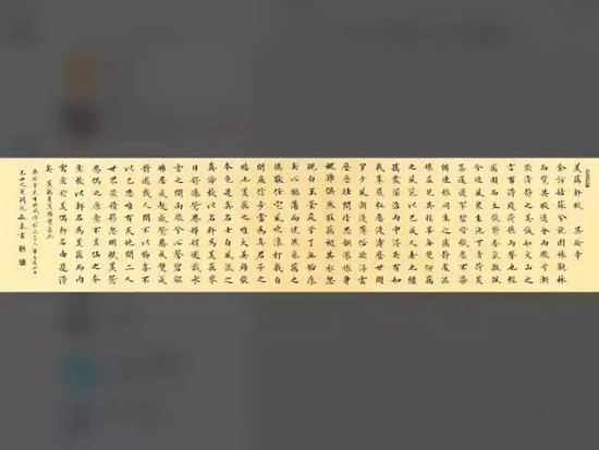 是書法作品中左右伸展較長(zhǎng)的一種格式,因?yàn)槠溟L(zhǎng)度遠(yuǎn)遠(yuǎn)大于高度,而且長(zhǎng)度太長(zhǎng)無(wú)法懸掛,只能用手邊展開(kāi)、邊欣賞、邊卷合,所以叫“長(zhǎng)卷”。它的內(nèi)容大多為一篇完整的文章或者一首長(zhǎng)詩(shī)詞。手卷篇幅較短的有三、四米,長(zhǎng)的可達(dá)數(shù)十米以上,寬度一般為三十至五十厘米之間。卷首外有“題簽”,卷內(nèi)開(kāi)頭有“引首”,后有“題跋”。