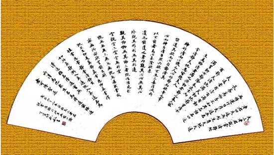 扇面指的是隨扇形書寫的作品。扇面形式有兩種:一種是圓形的團(tuán)扇,也叫園光。書寫時(shí)要能充實(shí)飽滿,也可以圓中取方,設(shè)方構(gòu)圖,現(xiàn)在還出現(xiàn)一種新形勢(shì),即:下半園寫字,上半園鈐一方印,也挺活潑;一種是折扇式,這種格式書寫時(shí),以折痕分行,呈圓心輻射狀,上寬下窄,外大內(nèi)小。章法并非一律,可用長(zhǎng)短行間隔的方式安排布局,適合扇形弧線式規(guī)律,這種格式顯得活潑優(yōu)美,尤其是小幅作品點(diǎn)綴性強(qiáng)。