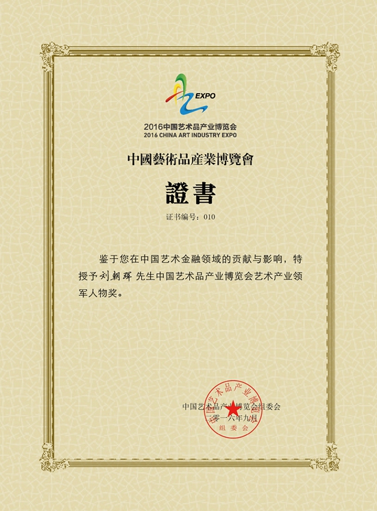 陜西胤華東方文化發(fā)展公司攜中國(guó)云美術(shù)最新成果,以“黑馬”姿態(tài)亮相博覽會(huì),該公司董事長(zhǎng)暨中國(guó)云美術(shù)創(chuàng)始人劉朝琿榮獲2016中國(guó)藝術(shù)品產(chǎn)業(yè)博覽會(huì)藝術(shù)產(chǎn)業(yè)領(lǐng)軍人物獎(jiǎng)。