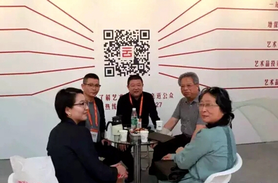 中國(guó)藝術(shù)品市場(chǎng)研究院副院長(zhǎng)西沐先生(右二)、中央財(cái)經(jīng)大學(xué)博士宗婭琮女士(左一)、陜西胤華東方文化發(fā)展公司董事長(zhǎng)、中國(guó)云美術(shù)藝術(shù)品商服平臺(tái)創(chuàng)始人劉朝琿(中)、中國(guó)云美術(shù)梁鵬飛老師(左二)一起在中國(guó)云美術(shù)展區(qū)探討