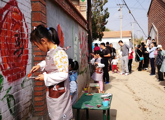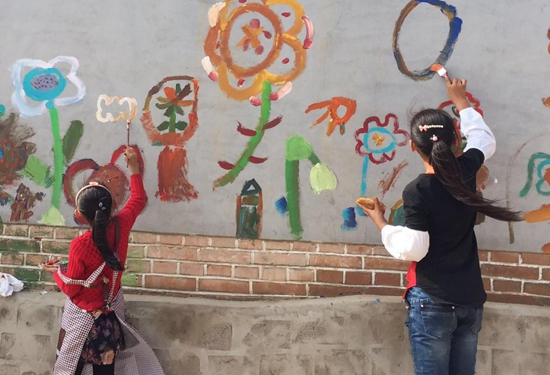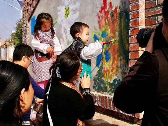 午飯后美術(shù)小天使們開始揮動手中的畫筆濃彩重抹,在修繕一新的墻壁上作畫。武家莊是張家口市下花園區(qū)所管轄的一個村莊。顧名思義,這里春夏之季山花爛漫,美不勝收。所以組委決定以十三個冬奧舉辦國的國花作為世界兒童美術(shù)村的開局題材。在老師的安排指導(dǎo)下,在家長的幫助配合下,美術(shù)小天使們個個興致勃勃,經(jīng)過四個小時的努力奮戰(zhàn),一朵朵天真稚拙的巨大花朵駐顏墻壁。同時,當(dāng)天村里也挑選了六位喜愛繪畫的小朋友參與了交流創(chuàng)作活動,將他們心中最美的花朵綻放到了家鄉(xiāng)的墻壁上。美化后的墻壁街景讓人眼前一亮,贏得了人們交口稱贊。