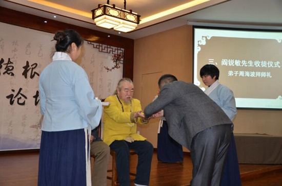 中國當(dāng)代著名書法家、書法教育家、中國人民大學(xué)書法課程副教授、碩士研究生書法導(dǎo)師、教職工書法培訓(xùn)班主講教師,北工大計算機學(xué)院客座書法教授,北京外國語大學(xué)客座書法教授。世界教科文衛(wèi)組織專家成員,國家職業(yè)技能鑒定專家委員會書法專業(yè)專家; 國務(wù)院辦公廳機關(guān)工會硬筆書法授課教師、國務(wù)院老干部活動中心書法導(dǎo)師、中國書畫家聯(lián)誼會教育培訓(xùn)中心書法專業(yè)副教授; 日本國藝書道院名譽理事、新加坡新神州藝術(shù)院高級榮譽顧問; 中華炎黃書畫家協(xié)會主席、中華炎黃文化研究會理事、北京書畫藝術(shù)院教育委員會主任、北京華藝書畫對外發(fā)展促進(jìn)會副主席、北京書畫藝術(shù)院網(wǎng)絡(luò)部主任兼官方網(wǎng)站站長、中華炎黃書畫家網(wǎng)站站長閆銳敏先生收徒儀式及弟子周海波拜師禮在淄博中道國學(xué)院舉行,參加這次儀式的還有淄博書畫學(xué)校姜長勝校長、藝星教育集團(tuán)畢貞和校長、天才美校李愛芹校長、德?lián)P教育孫校長等。