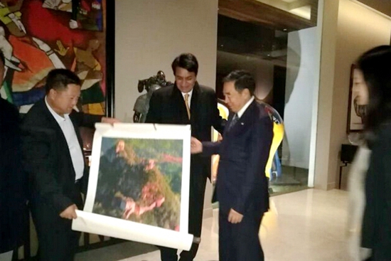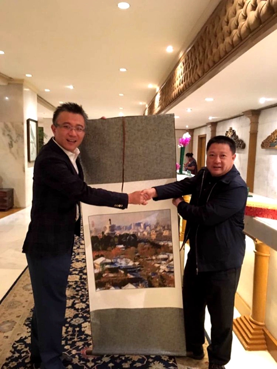 東方君公益基金會會長、中華炎黃文化研究會硯文化聯(lián)合會常務(wù)副會長、中華光影平面油畫藝術(shù)學(xué)會名譽會長董方軍向印度億萬富翁、著名慈善家薩提斯·莫迪(Satish Modi)先生介紹并贈送由于江老師創(chuàng)新的光影平面油畫作品。薩提斯·莫迪(Satish Modi)先生給予了充分的肯定和高度認同,并就下一步中華光影平面油畫藝術(shù)在印度的展覽,交流及合作進行了交談。