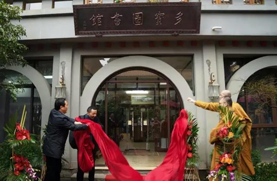 而后嘉賓們從會場移步至多寶圖書館門前,一起見證多寶圖書館的揭牌。黃文剛局長、黃晨老師、宗宙法師、賢才法師共同為多寶圖書館揭牌,多寶圖書館正式開館。