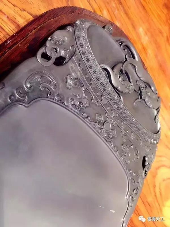 此硯選料上好老坑,整個硯堂被碩大的魚腦凍貫穿,且布滿老坑優(yōu)秀石品青花、冰紋和火捺,在一方老坑中能聚集如此優(yōu)秀的石品實乃罕見。整方硯石呈現(xiàn)老坑特有的紫中帶青灰色,硯四周雕刻了中國傳統(tǒng)紋飾——云龍,線條雕刻厚重,有“明代”之風(fēng),工藝細(xì)膩、精致。