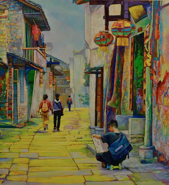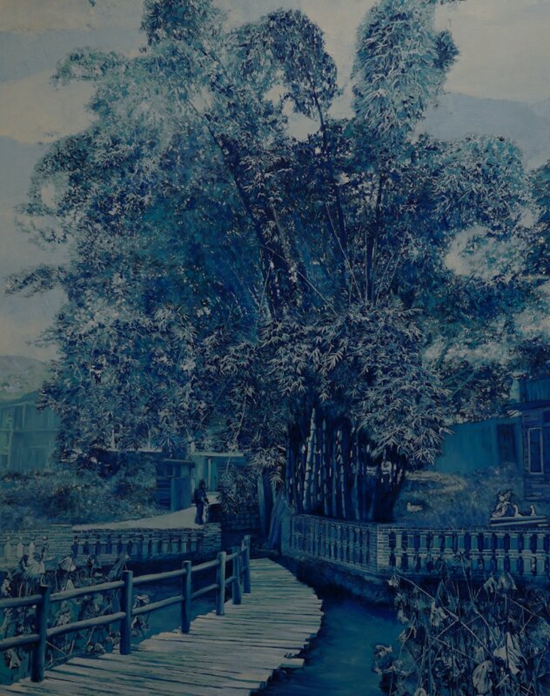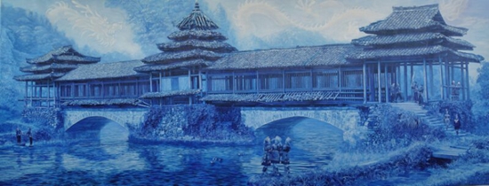 深沉鮮活的中國青花瓷文化是最能代表中國傳統(tǒng)文化的意象之一。作者以田野式調(diào)查方式與非遺文化視覺深入湘西,用傳統(tǒng)青花意象觀照今日時(shí)代巨變的湘西,表現(xiàn)湘西風(fēng)光,記錄湘西人文,傳承湘西非遺成果。一方水土養(yǎng)一方人,湘西文化在幾千年的發(fā)展歷程中,大量的非物質(zhì)文化遺產(chǎn)符號和當(dāng)?shù)刈匀晃幕z產(chǎn)緊密相聯(lián),在人們的生活方式中和諧發(fā)展,逐漸形成了獨(dú)特的湘西文化遺產(chǎn)譜系。在人們審美多元化的今天來欣賞青花非遺油畫作品的確給人一種視覺和精神上的滿足感,其劉家樣個(gè)性風(fēng)格的藝術(shù)手法以其精準(zhǔn)的造型、高雅的色彩、個(gè)性化的筆觸、精湛的制作技藝、奇特的創(chuàng)意以及全新的觀念,描繪出了湘西如詩如畫的古村落、古剎、風(fēng)雨橋、民居,街市;以及畫面里出現(xiàn)的人物形象,織藝印染,金銀頭飾都能和諧完美地傳達(dá)出一種古韻今輝的時(shí)代表情。其立意之高遠(yuǎn),內(nèi)容之豐富,歷史之久遠(yuǎn),符號之多樣,技法之全面為中國畫壇之首創(chuàng)。