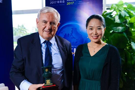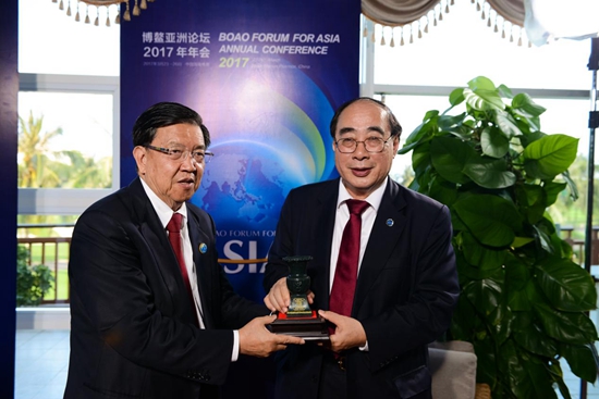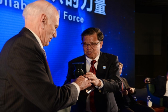 原外經(jīng)貿(mào)部副部長(zhǎng)、博鰲亞洲論壇前秘書長(zhǎng)龍永圖(左),將中國(guó)尊贈(zèng)與聯(lián)合國(guó)副秘書長(zhǎng)吳紅波(右)