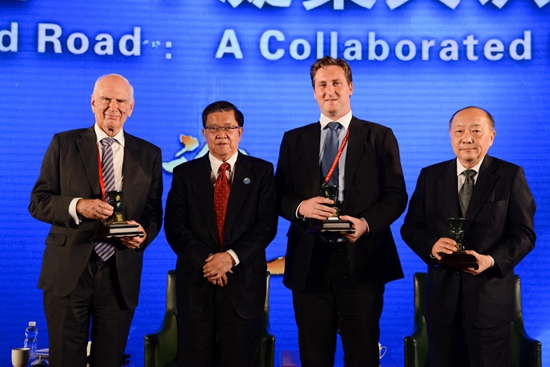 博鰲亞洲論壇前秘書長(zhǎng)龍永圖(左二),將中國(guó)尊贈(zèng)與澳大利亞執(zhí)政黨主席理查德(左一)、達(dá)沃斯澳洲主席Stephen(右二)、中國(guó)海外協(xié)會(huì)會(huì)長(zhǎng)胡衛(wèi)平(右一)