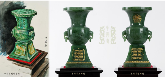 中國(guó)尊創(chuàng)作手稿(左)、中國(guó)尊正面(中)、中國(guó)尊背面(右)