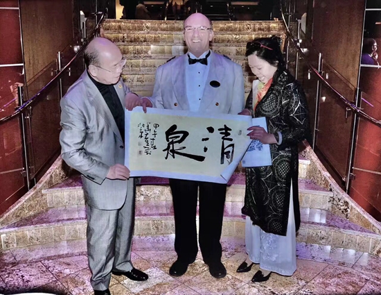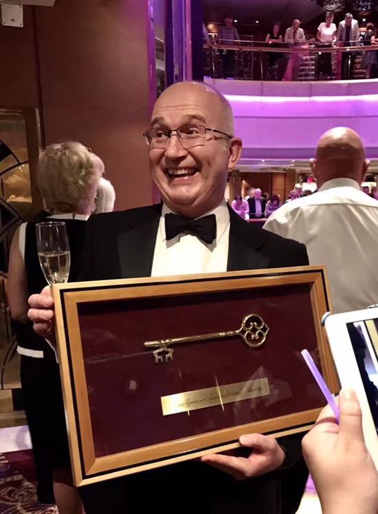 “海洋神話”號此航結(jié)束將轉(zhuǎn)讓給另外的郵輪公司, 在交接儀式上,從老船長手中接過金鑰匙的新船長喜形于色(華奎攝影)