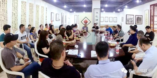 采風活動今天走進了中國中晨(青州)國際文化藝術小鎮(zhèn),并首先在寶瀛齋畫社駐足,青州市畫廊協(xié)會副會長唐樹良向“藝術金融博士課程班” 的導師西沐及老師同學們詳細講解了青州書畫市場的形成和發(fā)展,并大體介紹了青州現(xiàn)有的書畫市場及創(chuàng)作寫生基地等市場概況。隨后中晨集團所屬山東大易文化發(fā)展有限公司副總邱方舜向大家介紹了中晨藝術小鎮(zhèn)項目規(guī)劃及現(xiàn)狀。研討會結(jié)束后老師和學員們參觀了青州書畫市場,并進行了深入探討。
