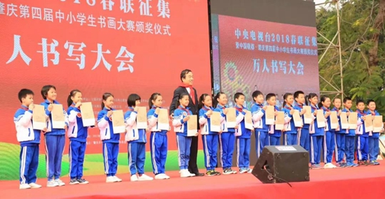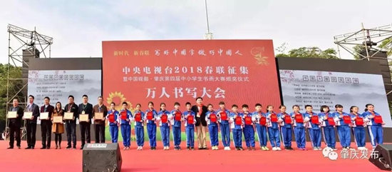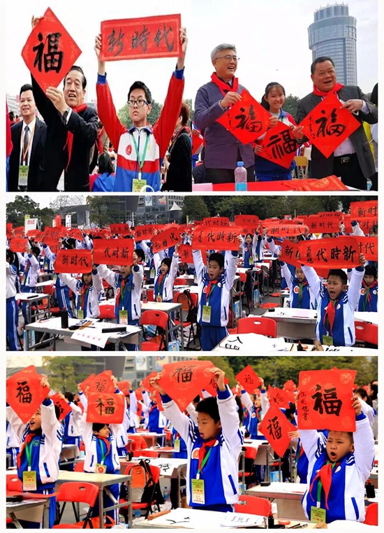 萬(wàn)人揮毫共寫:新時(shí)代、福;萬(wàn)名中小學(xué)生共舉萬(wàn)福,齊聲高喊:“寫好中國(guó)字,做好中國(guó)人”、“我家春聯(lián)我來(lái)寫”,童音響徹云霄,在肇慶地標(biāo)七星巖牌坊廣場(chǎng)久久回蕩。