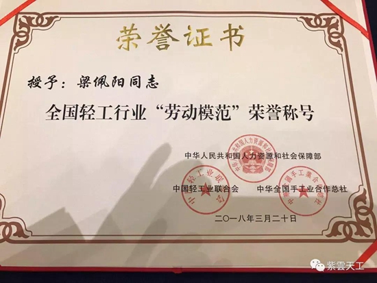 熱烈祝賀梁佩陽(yáng)大師榮獲輕工行業(yè)“全國(guó)勞動(dòng)模范”榮譽(yù)稱號(hào)!