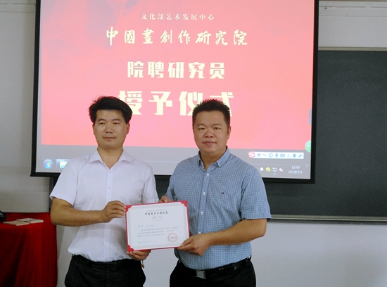 2018年7月1日,中國畫創(chuàng)作研究院研究員聘任儀式在文化部藝術發(fā)展中心舉行。文化部藝術發(fā)展中心培訓部主任,中國畫創(chuàng)作研究院院長袁學君,中國文化產(chǎn)業(yè)智庫研究中心首席科學家、中國藝術產(chǎn)業(yè)研究院副院長、文化部藝術發(fā)展中心首屆藝術金融博士課程班首席導師西沐,中國畫創(chuàng)作研究院辦公室主任、中國畫美術館副館長陳斐鵬,藝術金融博士課程班班主任袁浩森等藝術家及藝術界代表、媒體等共同見證了這一時刻。袁學君主任和西沐院長親自為首屆中國藝術金融博士課程班學員,中國非遺資源管理評價研究委員會副秘書長、中國非遺藝術設計研究院理事會秘書長黃中頒發(fā)中國畫創(chuàng)作研究院研究員聘任證書。