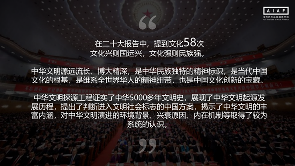 在二十大報(bào)告中,文化一詞就提及了58次。這是一個(gè)高感性的名詞,也是我們所有人需要關(guān)注之處。中華文明探源工程,它首次被列為國家戰(zhàn)略。中華文明探源工程證實(shí)了中華5000多年文明史,展現(xiàn)了中華文明起源發(fā)展歷程,提出了判斷進(jìn)入文明社會(huì)標(biāo)志的中國方案,也揭示了中華文明的豐富內(nèi)涵。未來中國的發(fā)展會(huì)迎來民族優(yōu)秀傳統(tǒng)的復(fù)興,我們期待能有更多參與和貢獻(xiàn)!于己于家于國,我們都要把家國情懷放在心里,做中國民族文化藝術(shù)復(fù)興百年大計(jì)的長期主義者!