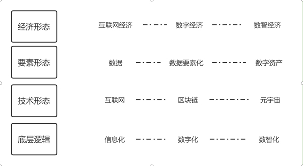 1、經(jīng)濟形態(tài)層面。它包括三個新經(jīng)濟形態(tài)的遞進: 互聯(lián)網(wǎng)經(jīng)濟形態(tài)、數(shù)字經(jīng)濟形態(tài)與數(shù)智經(jīng)濟形態(tài)。