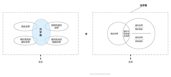 圖中我們可以清晰的看出元宇宙的生態(tài)組成和其內(nèi)部的關(guān)系。首先是現(xiàn)實世界、創(chuàng)新的虛擬世界、模擬現(xiàn)實的虛擬世界和虛實結(jié)合的超越世界,這四個部分的融合地帶就是我們所說的元宇宙。這是基于元宇宙虛實相生、虛實結(jié)合的基座而言,也是整個生態(tài)的組成部分之一。而在右邊的生態(tài)之中,虛擬世界被分成了模擬現(xiàn)實的虛擬世界和創(chuàng)新虛擬世界,以及與現(xiàn)實世界交錯的虛擬與現(xiàn)實融合世界,這一整個生態(tài)形成了元宇宙系統(tǒng)。雖然是同樣的四大板塊,但是其不同的交錯和融合方式背后則是數(shù)智化過程中元宇宙系統(tǒng)的發(fā)展和變化。