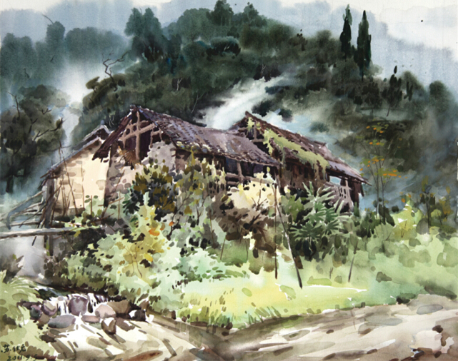 他的作品突破了傳統(tǒng)西洋畫的形式與構(gòu)圖,賦予表現(xiàn)對(duì)象以全新的視覺(jué)感受,在他的作品中,水彩水色交融的繽紛絢麗與中國(guó)本土的水墨淡彩不期而遇,孕育出了濃厚的東方意味。他無(wú)異于糾纏自然物象細(xì)枝末節(jié)的描繪,而是將簡(jiǎn)約空靈的寫意美與清新透明的寫實(shí)美融合,以精煉的筆觸、輕快的節(jié)奏、獨(dú)特的水色盡情地抒發(fā)對(duì)自然的向往與感受。繪畫語(yǔ)言的濃縮和提煉,使他的水彩畫更加簡(jiǎn)潔而層次分明,明快而深含雋永;流暢的線條和大塊面的結(jié)合,疏朗有致,沉著與紫灰的色調(diào)更具淡淡的鄉(xiāng)愁和深沉。在蘇仕元的水彩作品中,我們看到的不僅是熟練的技法,更重要的是畫作中展現(xiàn)的中國(guó)畫的悠遠(yuǎn)意境,如涓涓細(xì)流悠悠地流進(jìn)觀者的夢(mèng)里。