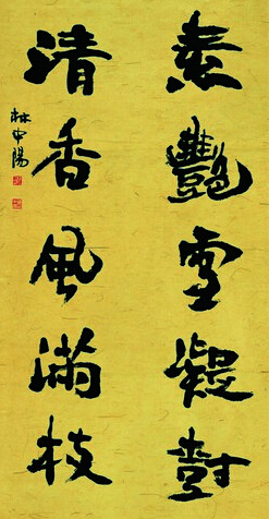 有的人說:林中陽的字,似乎缺少一點秀,少了一份精到。這是存在的事實,也自有一番道理。但我以為,論做人,當(dāng)先觀其大略,書法藝術(shù)也須如此。他的作品的字里行間,洋溢著他對過去的艱難喝艱辛求索書藝的反抗。洋溢著他對生活的渴望,對人生的理解,對事業(yè)和未來的向往,始終張揚著一種不屈不撓的精神,這就是:大氣磅礴,豪氣云天。所以,他的筆下,不去刻意地雕塑細微的東西,而是放筆縱橫;不去秀媚以宜人,而是蒼茫追曠達。正如古人所言:“當(dāng)其下筆風(fēng)雷快,筆未到時氣咿吞”。中亦使我想到了吳昌碩的一句名言:“苦鐵書氣不畫形”。無論畫家還是書法家,確實“氣”是很重要的。有眼光的鑒賞家,先觀其氣息、氣質(zhì)、氣勢、氣魄、氣度。誠然,我們亦需要“黛玉之美”的“品種”,但更需要“陽剛正大”,我們不能要求魯智深放下月牙鏟,去坐在兒女堆中吟詩填詞,或者打著鼓兒唱“春江花月夜”。林中陽的字,是激越的黃河謠,是劉歡唱出的“好漢歌”。
